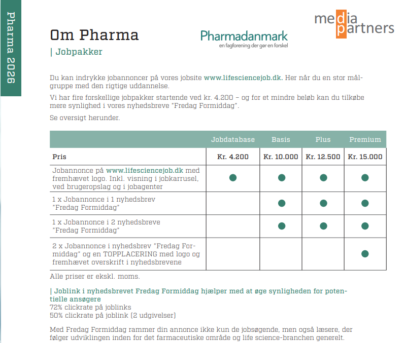 Priser på fremhævede jobannonce på lifesciencejob.dk samt indrykning i nyhedsbreve og profilering på pharmadanmark.dk